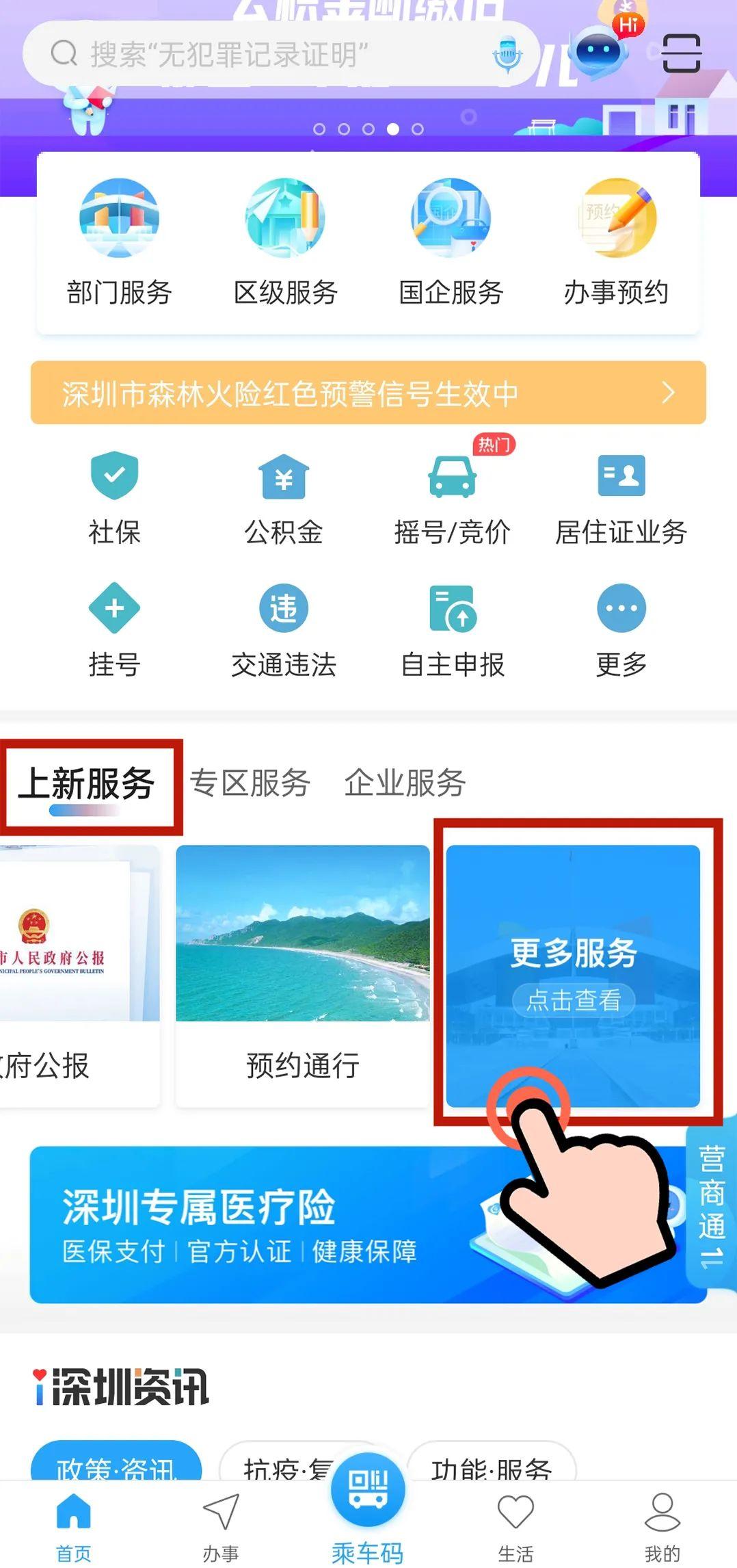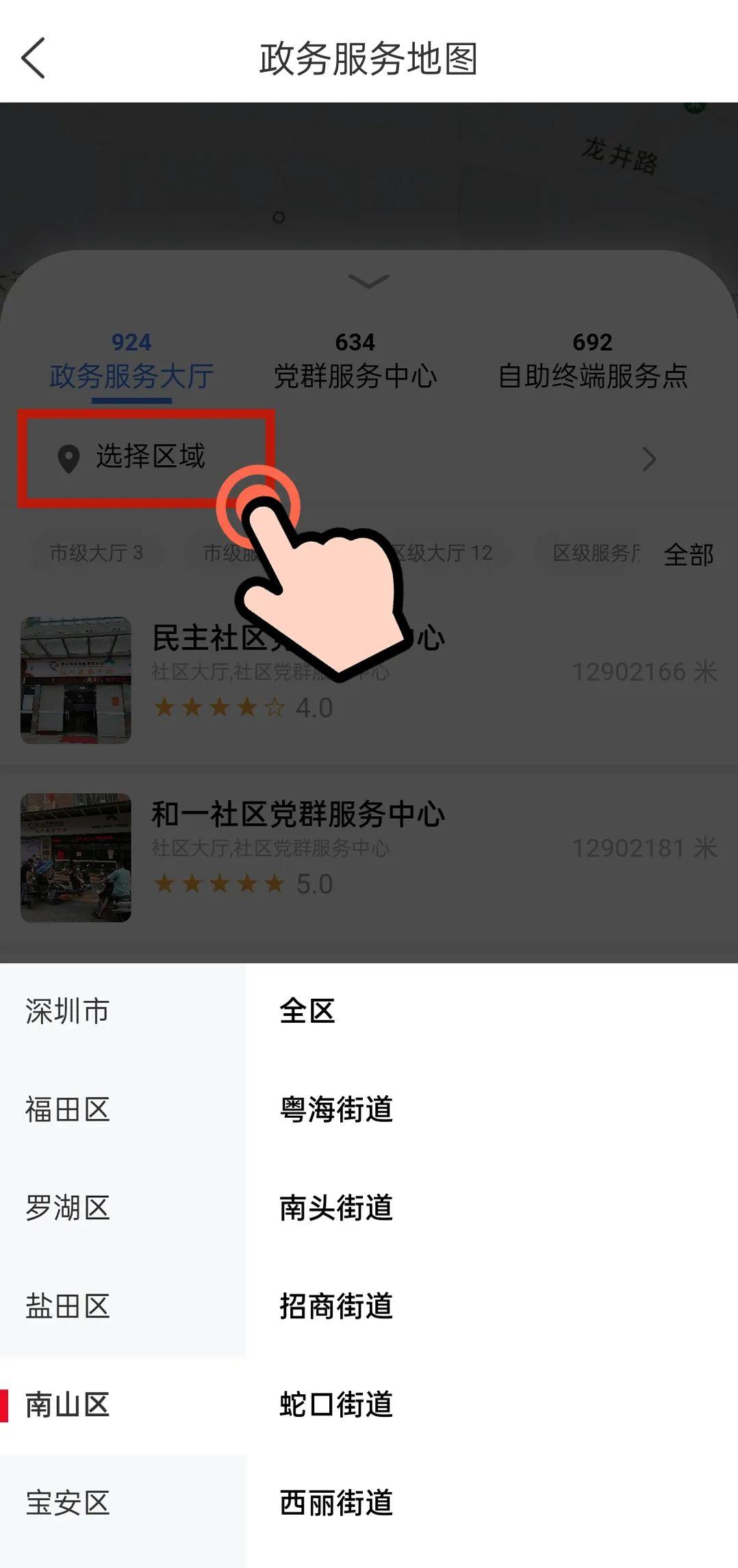 打开“i深圳”App,在首页“上新服务”栏目滑动至“政务地图”,点击进入,通过“选择区域”查找便捷的政务服务自助终端所在地址。