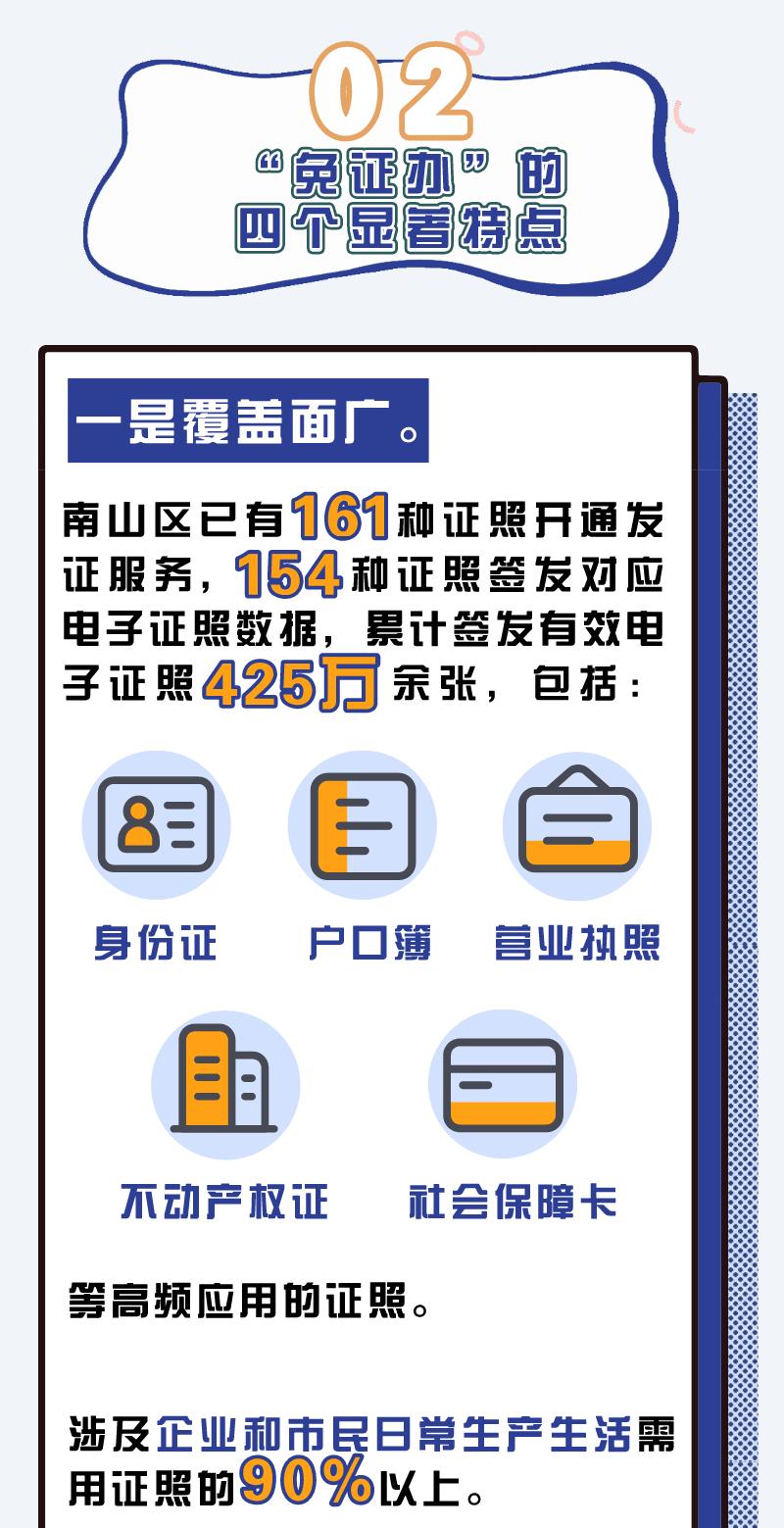 南山区政务服务数据管理局将持续推进政务服务“四免”优化专项工作,逐个事项推动电子证照、数据共享、电子印章、电子签名等“应用尽用”,逐步实现“免提交”“免填写”“免用实物印章”“免用手写签名”,不断提升政务服务效率和体验感,打造无实体卡证城区,充分发挥省“数字政府”改革建设对政务服务便民化工作的支撑促进作用。