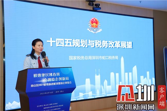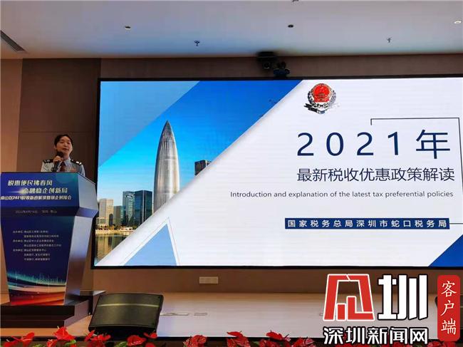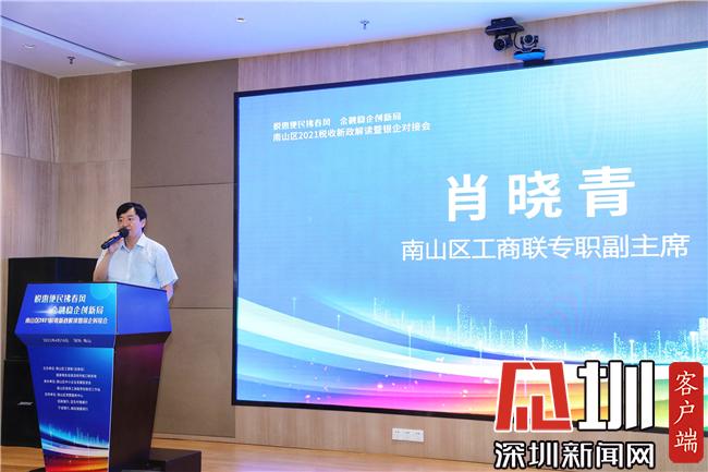 见圳客户端、深圳新闻网讯(记者 王志明 通讯员 蒋辉)4月16日下午,由南山区工商联和蛇口税务局联合主办、南山区中小企业发展促进会和政协工商联界别委员工作站承办的“税惠便民拂春风,金融稳企创新局”——南山区2021税收新政宣讲暨银行普惠金融专项对接会在南山区党群服务中心举行。蛇口税务局局长陈滨、副局长何隽,南山区工商联专职副主席肖晓青以及180多位企业、银行代表参加了活动。