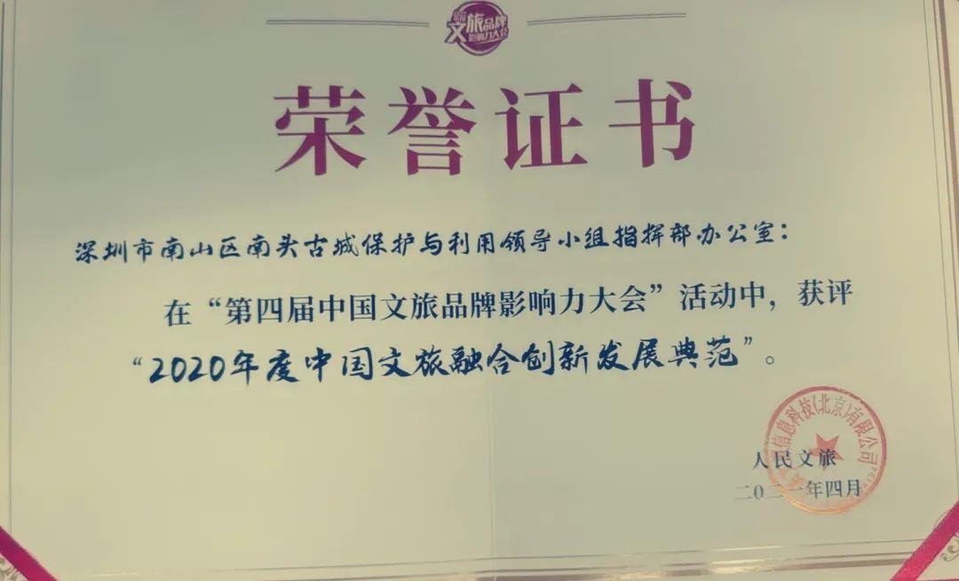 大会共推荐了九大类、42项年度荣誉案例,以鼓舞变革期的文旅行业,用榜样给行业指引方向、树立信心。其中,南头古城保护与利用工作项目荣获“2020年度中国文旅融合创新发展典范”殊荣。