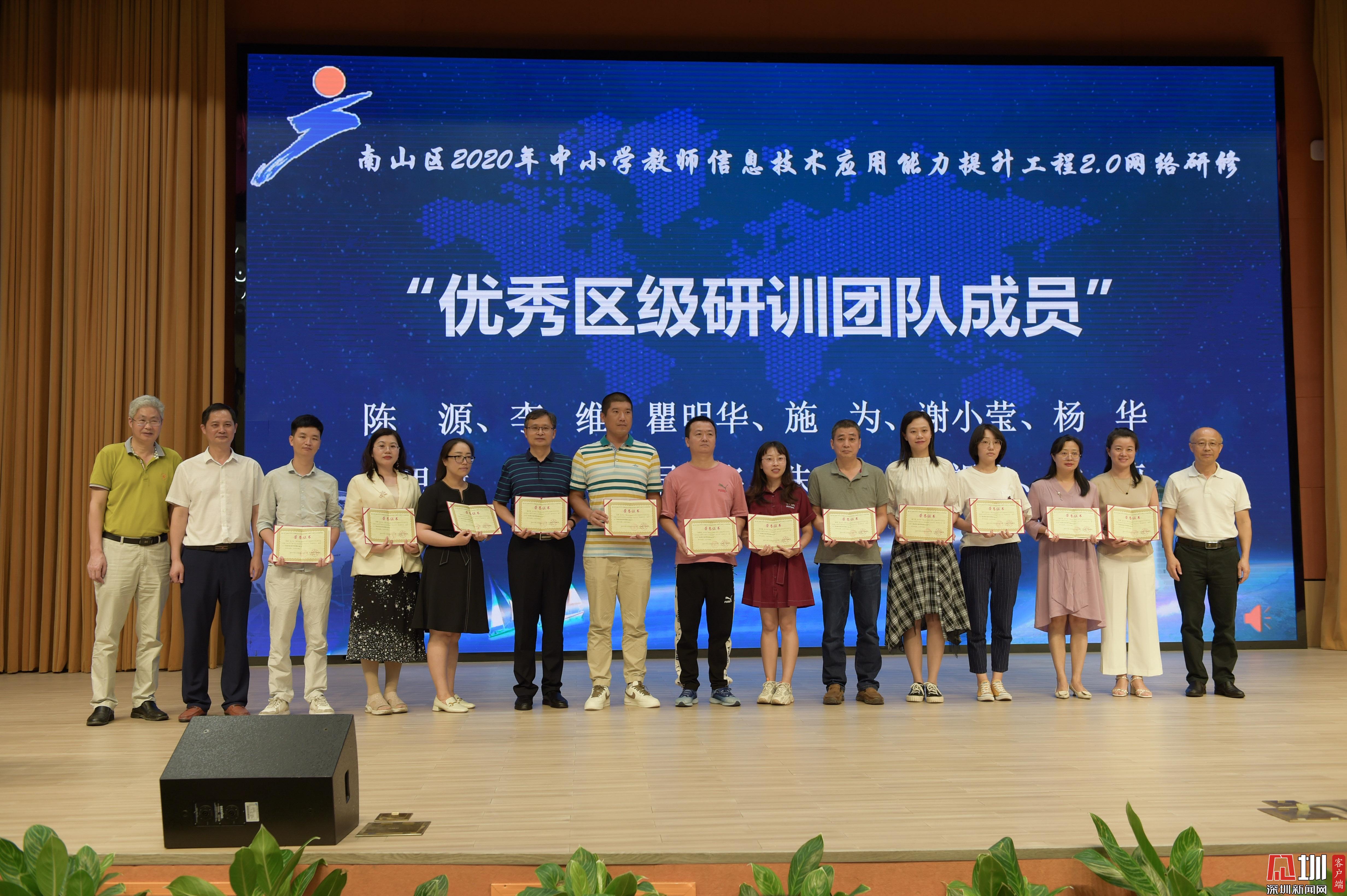 本次推进会上,广东省能力提升工程办公室汪和生副主任、深圳市教育科学研究院教师继续教育管理办公室熊冠恒主任、南山区教育科学研究院余耀贤院长共同为2020年南山区能力提升工程2.0第一阶段优秀区级研训团队成员和南山区能力提升工程2.0区级研训团队成员代表分别颁发了荣誉证书和聘书。南山区教育科学研究院教师研训部银艳琳部长宣布博伦职业技术学校、大新幼儿园等25所中小学幼儿园作为南山区能力提升工程2.0试点校。