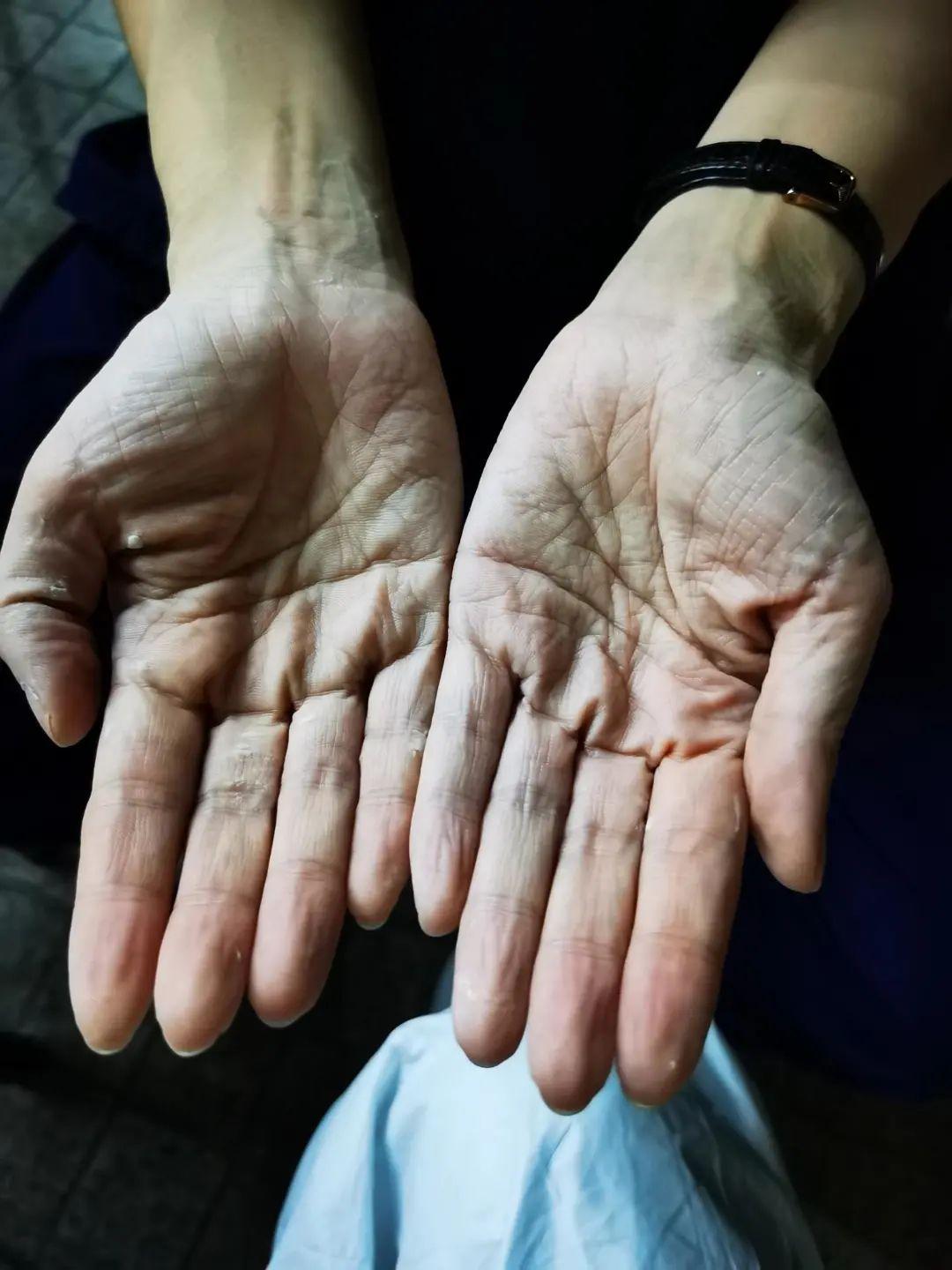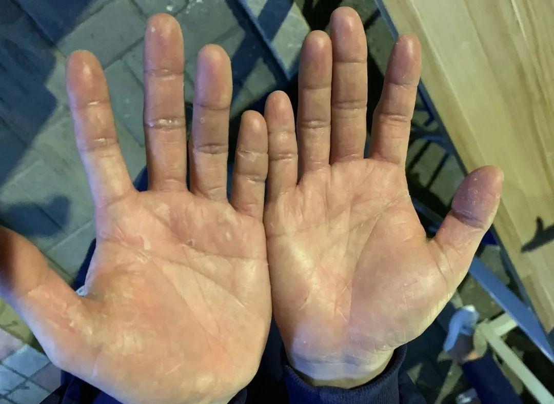被汗水浸泡过的双手已经脱皮