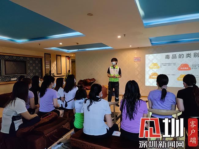 见圳客户端·深圳新闻网2021年6月1日讯(记者 王志明 通讯员 刘晓彤)为进一步加强辖区公共娱乐场所禁毒宣传力度,切实提高娱乐场所从业人员对毒品的认识及防范能力。6月1日,在南山区禁毒办的支持下,西丽街道温馨禁毒社工到辖区娱乐场所开展以“娱乐无毒,你我共创”为主题的禁毒反诈普法系列宣传活动。
