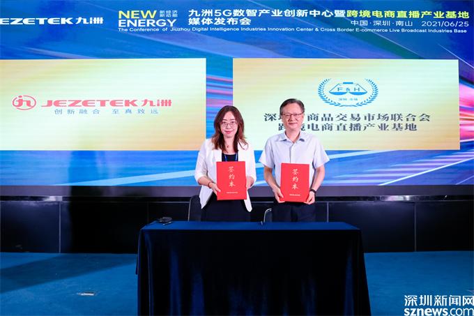读特客户端·深圳新闻网2021年6月26日讯 (记者 王志明)深圳市商品交易市场联合会与九洲5G数智产业创新中心共建的跨境电商直播产业基地,于6月25日在深圳九洲产业园区举办了入驻项目签约媒体发布会,本次发布会采用“线下举办、线上直播”的方式,运用“现场直播+直播云端多路分发”的技术,同时在新华社现场云等平台进行直播。