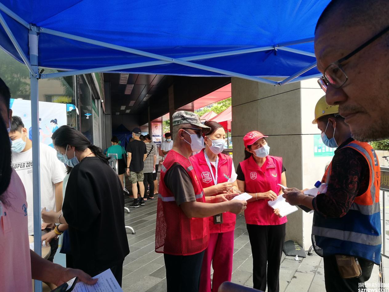 “你辛苦了,快歇一会吧。我来帮你守这个门。”一名红星志愿服务队队员注意到科技园社区一名帮助测量过往人群体温的工作人员满头大汗,边劝其休息边接过他手中的体温测量器,“请大家提前出示粤康码,并配合我们进行体温测量。”经过长达一月的防疫志愿活动的开展,红星志愿服务队队员显然对“防疫守门”这项工作“驾轻就熟”。同样“驾轻就熟”的,还有协助医护人员进行新冠疫苗接种工作。“请大家排成一列、保持距离。我手上拿着的白色纸张是接种疫苗知情同意书,请大家认真阅读后签上自己的名字,并在空白处填上联系方式和身份证号。”几名红星志愿服务队队员相互配合,一人发知情同意书和签字笔给前来接种的群众;一人手持二维码让排队人群进行手机扫描、出示疫苗接种信息预登记码;其余队员则分散在人群中,帮助不太会使用手机的老年人进行扫码登记。