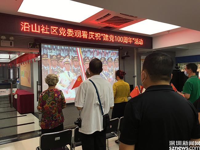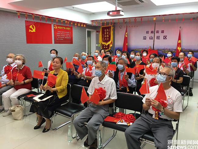 南山区招商街道沿山社区,组织了社区50年党龄以上的老党员,胸佩大红药,手拿党旗,收听收看了庆祝中国共产党成立100周年大会。