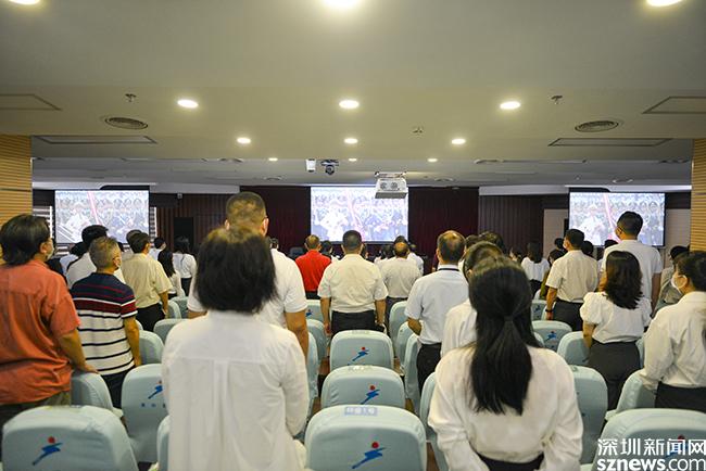 南山区水务局组织全体党员、入党积极分子和团员,收听收看大会现场直播盛况。在观看直播时,随着鲜红的五星红旗在激昂嘹亮的国歌声中冉冉升起,全体人员聚精会神,原地站立,跟随国歌进行合唱与主会场同步响应。