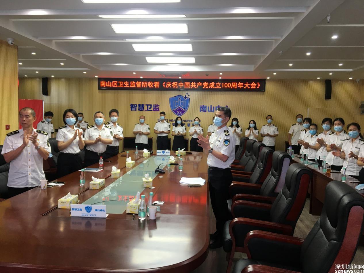 南山区卫生监督所组织本单位的全体在岗干部职工,统一着装,党员胸前佩戴党徽,通过数字大屏幕收听观看了本次直播盛况。