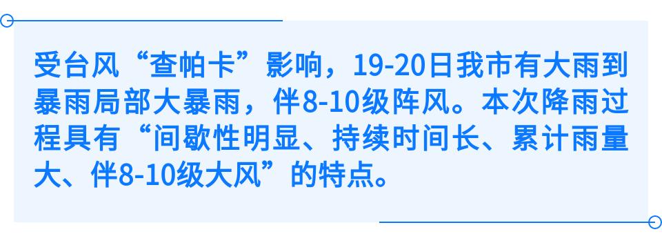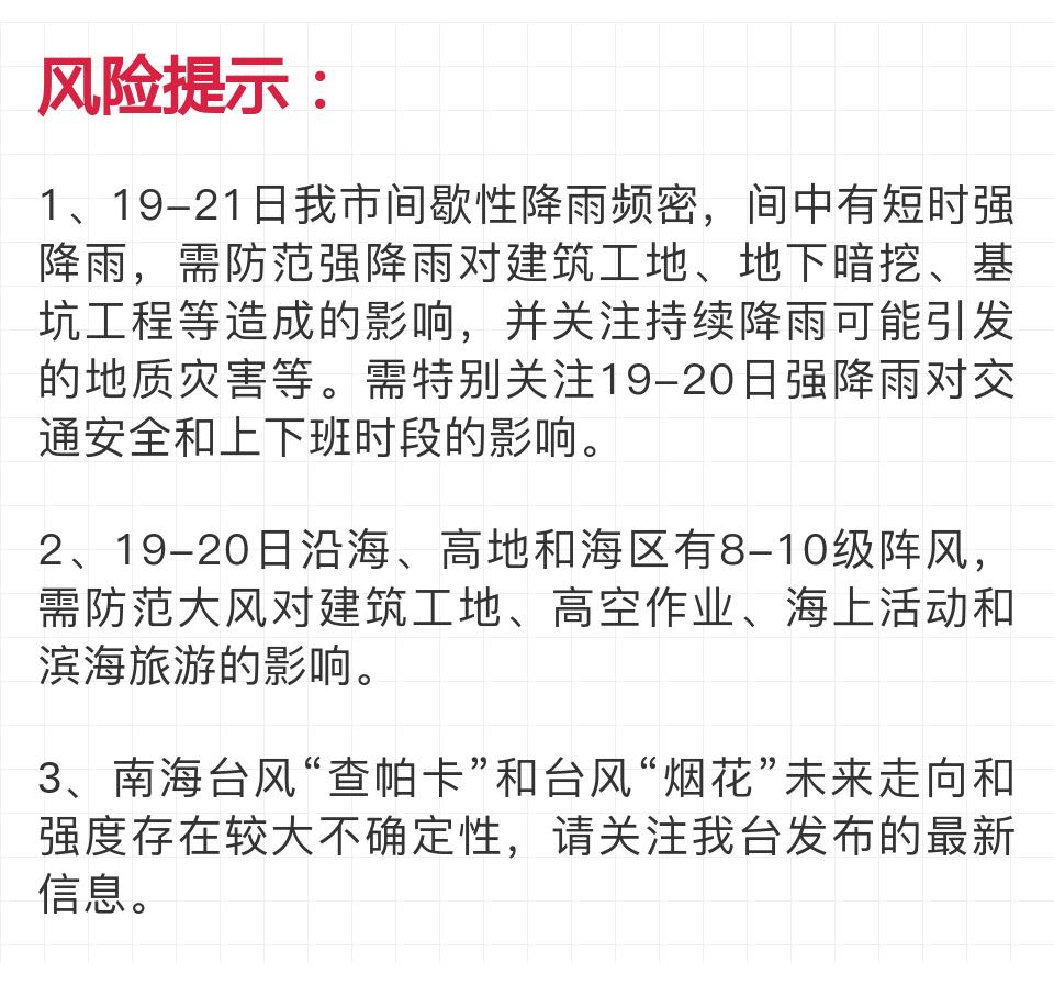19日白天我市间歇性降雨频密,局部可达暴雨,雨时伴有8-9级短时大风;19日夜间至20日为强降雨主要时段,有大雨到暴雨,局部大暴雨,沿海、高地和海区有8-10级阵风;21日局部仍有暴雨。