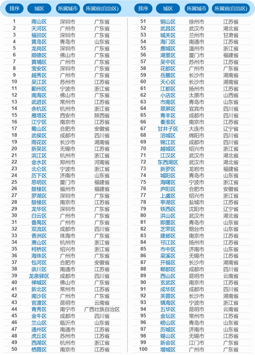 在百强区榜单中,深圳市南山区、广州市天河区、深圳市福田区排名前三位。这也是南山区连续四年位居全国百强区第一。