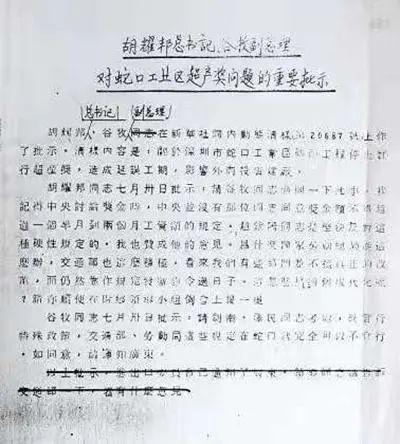 《胡耀邦总书记、谷牧副总理对蛇口工业区超产奖问题的重要批示》复印件