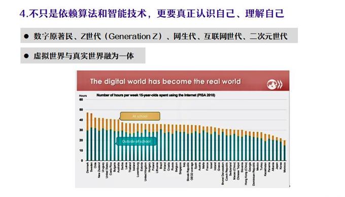 从依赖走向独立是一个人成长成熟的轨迹。人工智能时代的儿童都是“数字原著民”,他们是“Z世代”(Generation Z)即1995—2009年间出生的一代人。他们一出生就与网络信息时代无缝对接,极大地受到数字信息技术的影响,对他们来说,数字世界已经成为了现实世界,许多国家的学生每周上网时长长达30、40小时,虚拟与现实融合,导致儿童成长中的困惑与依赖,甚至严重影响了他们的人生观和世界观,其真实判断力也会变得虚弱、颠倒,有时对生命都有了虚幻和虚无感。