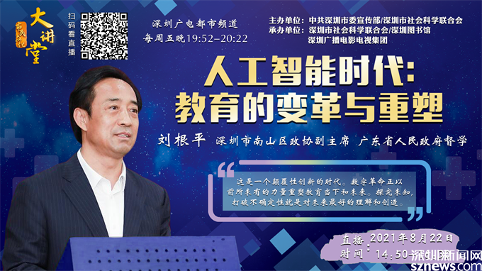 读特客户端·深圳新闻网2021年8月22日讯(记者 王志明 通讯员 赵小平)8月22日下午,继去年做客市民文化大讲堂讲述了“疫情如何改变教育?”后,南山区政协副主席、南山区教育局原局长、广东省人民政府督学刘根平,再次登上市民文化大讲堂,以《人工智能时代:教育的变革和重塑》为题,分享了他对科技如何改变教育的心得与体会。