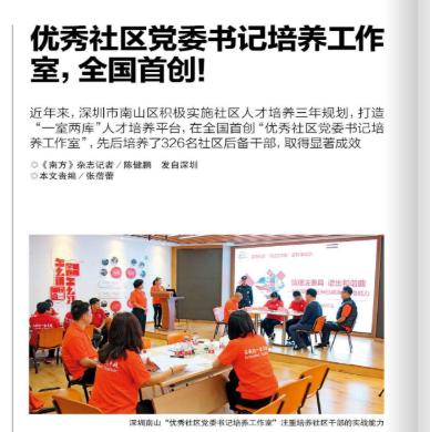 在找准南山区基层治理人才培养存在问题的基础上,为进一步促进社区党委书记及后备干部队伍的能力提升,优化社区人才队伍结构,加强党建引领社区治理工作水平,经过深入调研,南山区制定了《深圳市南山区社区人才培养三年规划》,在全区8个街道分别建立优秀社区党委书记培养工作室,旨在培养一批跟党走、听党话、作风硬、能力强的社区党委书记。