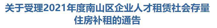 根据《深圳市保障性住房条例》《深圳市人才安居办法》《关于深化住房制度改革加快建立多主体供给多渠道保障租购并举的住房供应与保障体系的意见》等规定,2021年度试行南山区企业人才租赁社会存量住房补租。现将相关事项通告如下: