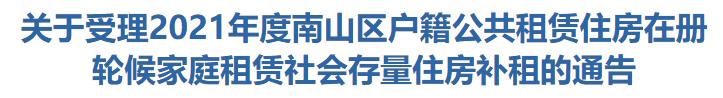 根据《深圳市保障性住房条例》《深圳市住房保障制度改革创新纲要》《关于深化住房制度改革加快建立多主体供给多渠道保障租购并举的住房供应与保障体系的意见》等规定,2021年度试行南山区户籍公共租赁住房在册轮候家庭租赁社会存量住房补租。现将相关事项通告如下: