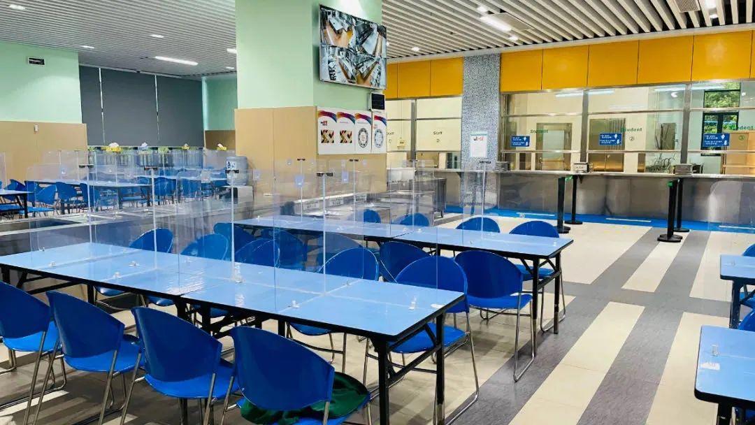 排球馆内,学生们正在教练指导下练球,食堂餐桌上设置了塑料隔挡防控疫情,供幼儿和小学阶段学生使用的图书馆温馨活泼。