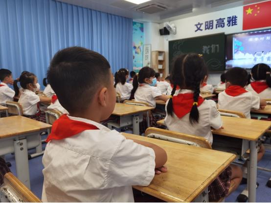 各班级在教室里通过线上直播参加开学典礼。南油小学校长王春平为学生们上了“开学第一课”,他勉励孩子们立足当下,去积累沉淀、去观察总结、去合作探究,奠定基础,完善人格,养育乐观自信的性格、丰满的精神、坚韧的意志,健全人格精神,播下真善美的种子。