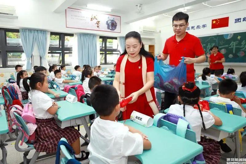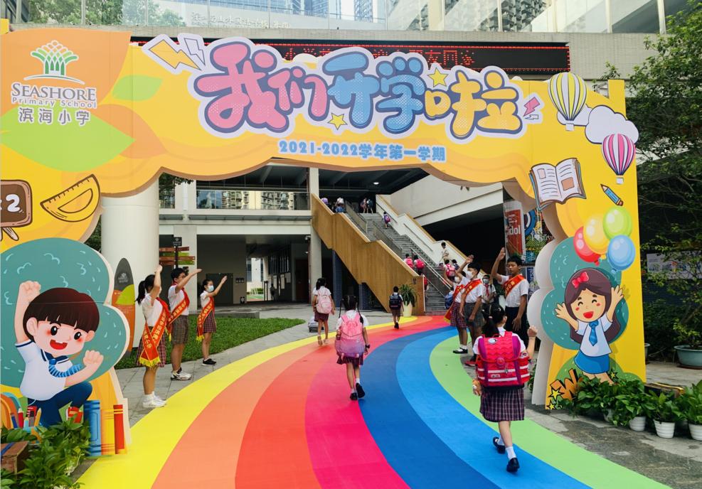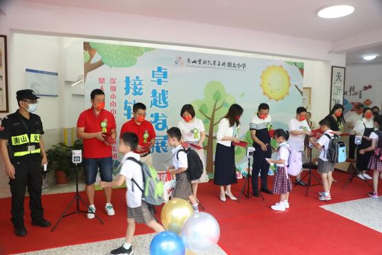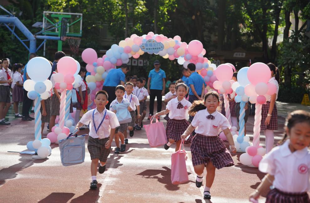 深圳大学附属教育集团后海小学,一群活泼可爱的一年级同学正走过“幸福门”,接过“后海袋子”,就要开启幸福的小学生活了。