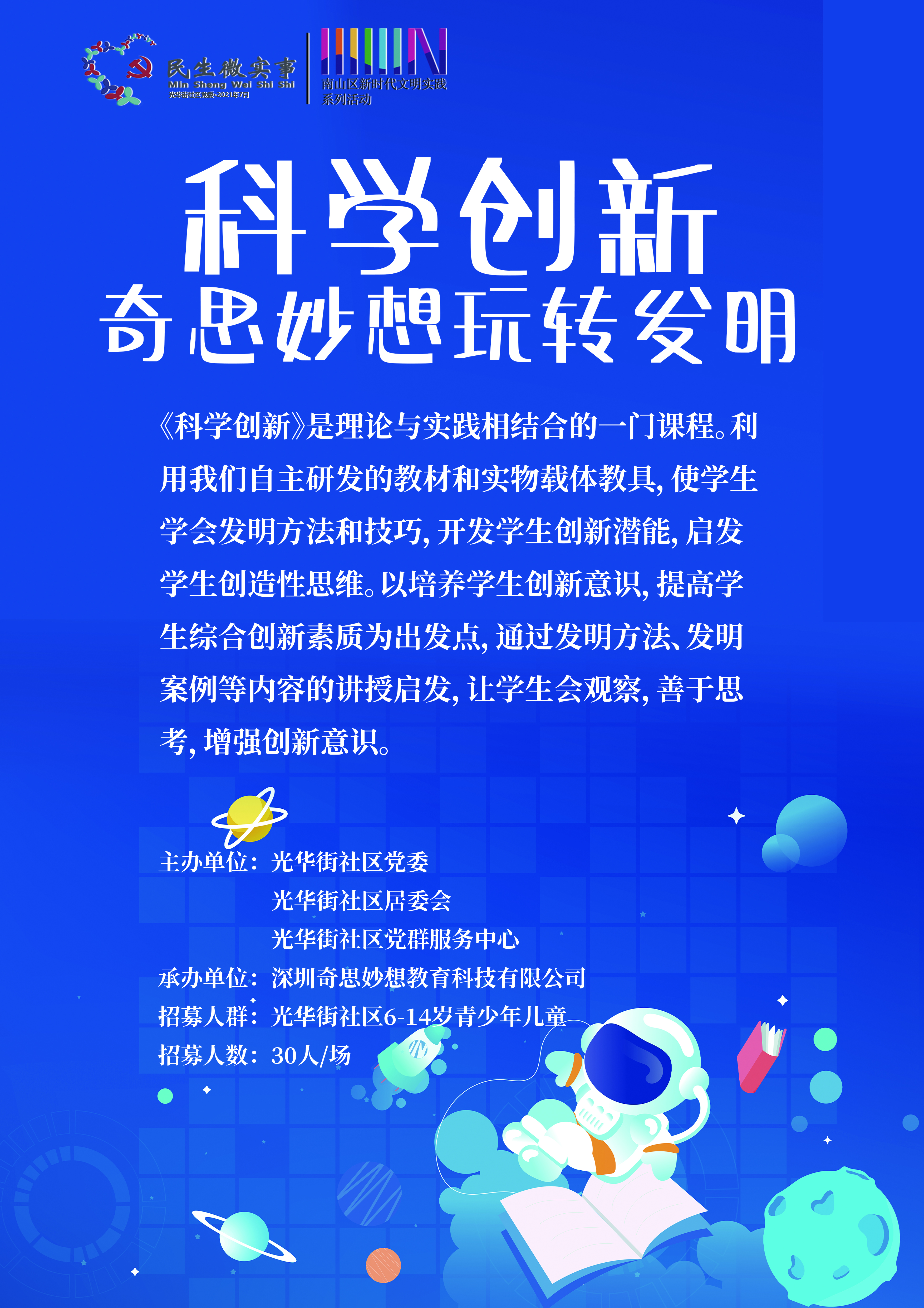 “科学创新——奇思妙想玩转发明”系列讲座由光华街社区党委、光华街社区居委会、光华街社区党群服务中心联合主办,是民生微实事项目、南山区新时代文明实践系列活动之一。