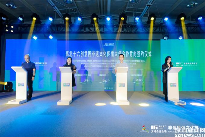 现场进行了“高北十六创意园非遗文化传播大使”合作意向签约仪式,深圳市盈致未来文创管理有限公司总经理焦永笃、中国满绣博物馆馆长,国家级满绣第四代传承人孙艳玲、“中国守艺人”项目发起人罗易成、雅瑞东方服装设计师黄月共同签约,未来将共同致力于推动中国传统手工艺的保护、传承及发展,共同推动时尚以及文化领域结合,为科技园片区提供崭新的传统文化交流平台,创造最前沿的时尚、文化新体系,呈现独特的生活方式。