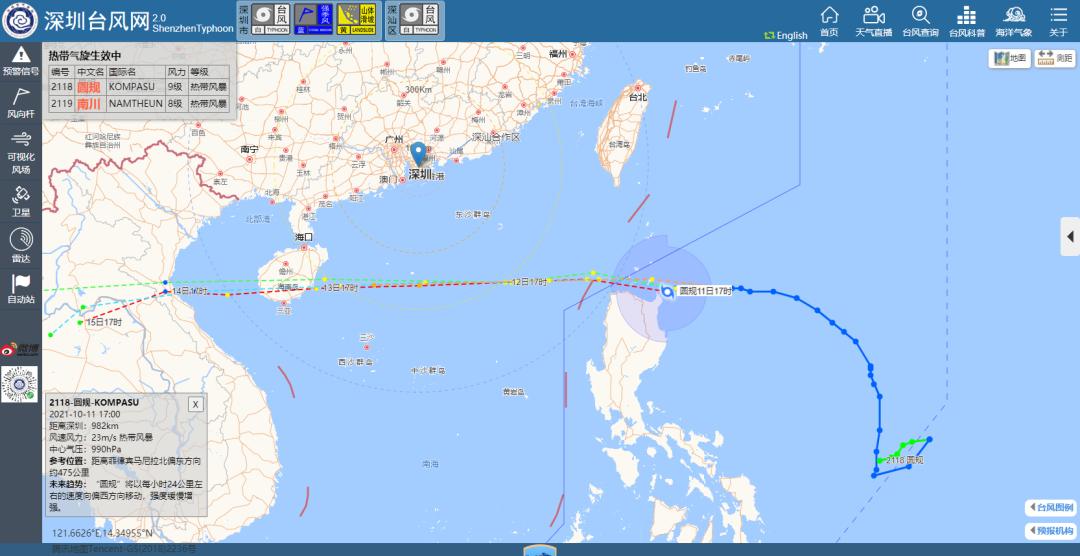 今年第18号台风“圆规”(热带风暴级)11日17时位于深圳东南方约980公里的太平洋洋面,预计11日夜间进入南海,12日夜间至13日凌晨从距离我市最近偏南方300-400公里左右的海面掠过。