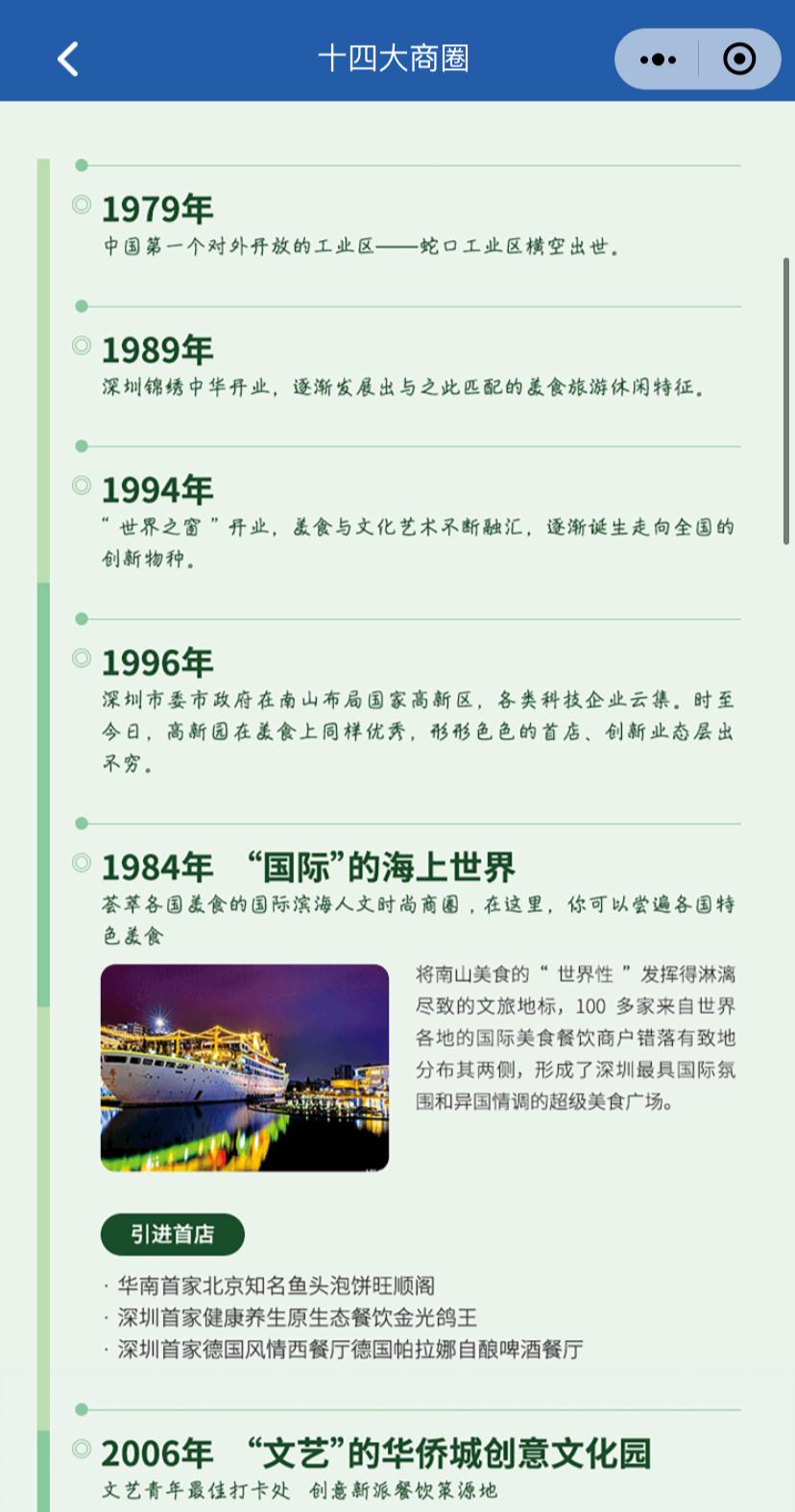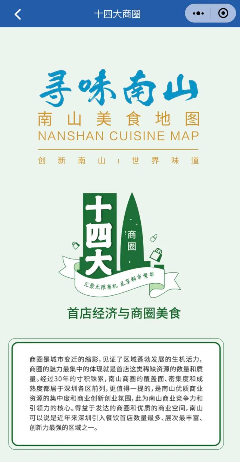 广大市民不仅可以在小程序中了解到南山区十四大商圈发展及首店经济,更可以根据定位,智能推荐附近商圈。
