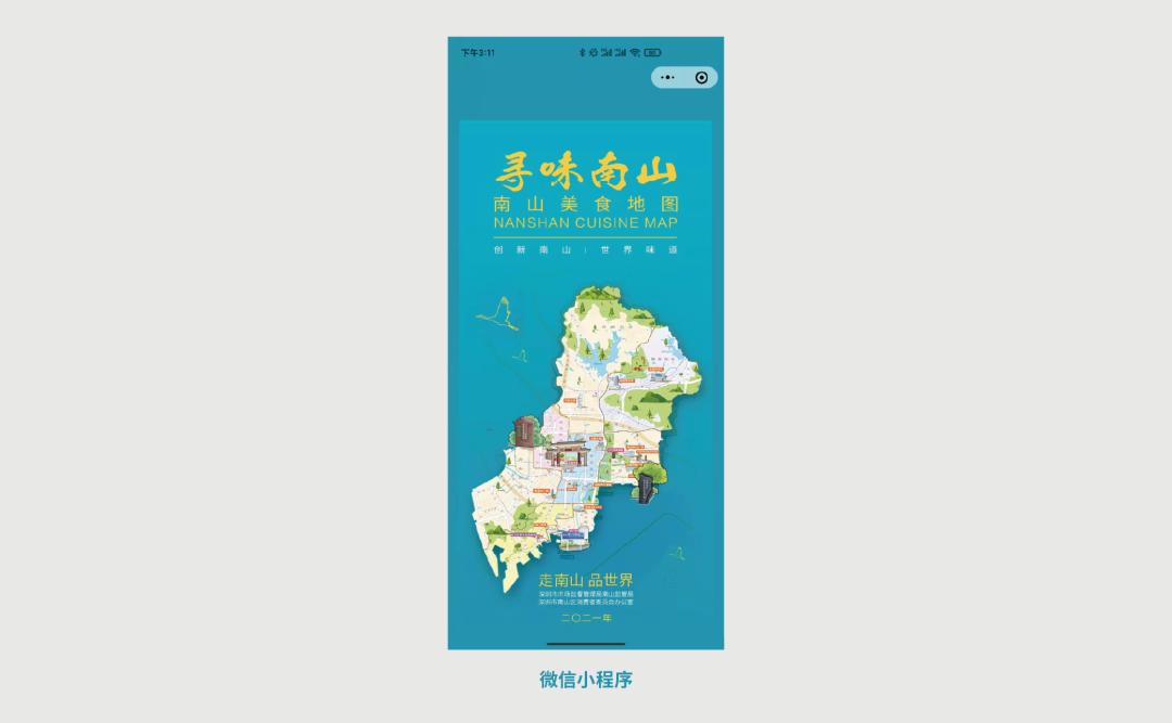 2021年,“寻味南山”作为南山首创的美食IP持续升级并扩大影响力,打造南山区2021年“3·15国际消费者权益日”主题活动并推出《寻味南山》(3·15版本);推出《寻味南山》(儿童版)、《寻味南山》(古城版)、《寻味南山》(线上小程序版)等版本。