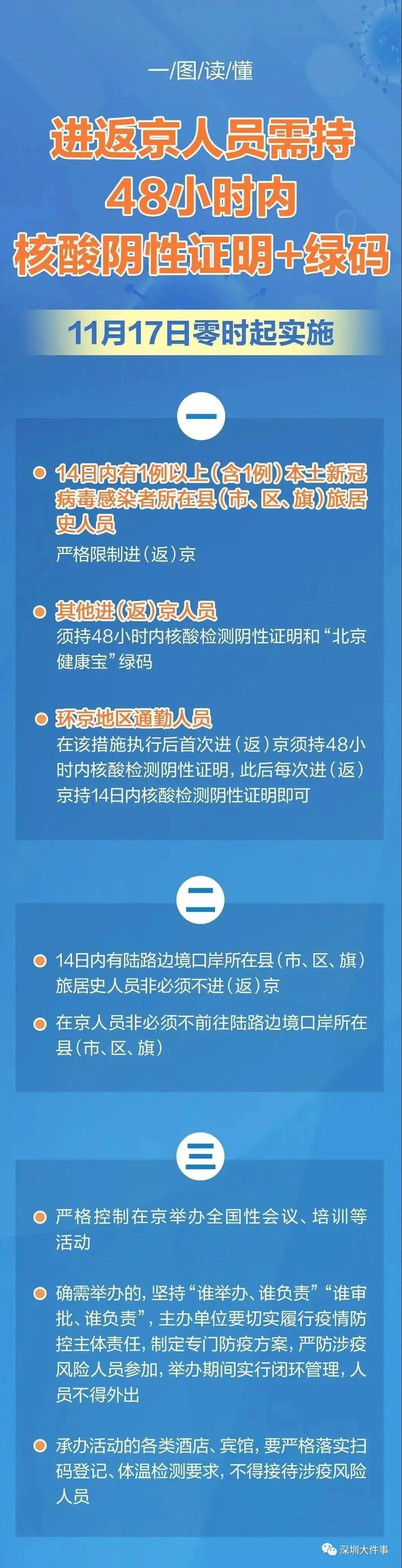 根据北京市最新疫情防控要求,自11月17日零时起,人员进(返)京须持48小时内核酸检测阴性证明和“北京健康宝”绿码,14日内有1例以上(含1例)本土新冠病毒感染者所在县(市、区、旗)旅居史人员严格限制进(返)京。
