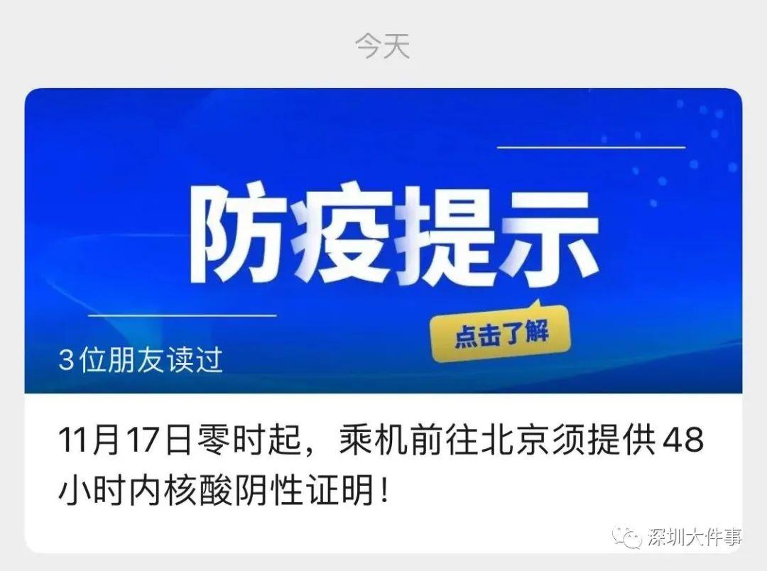 按照以上防疫政策,11月17日零时起,深圳机场将取消进京航班线上值机及自助值机服务,进京航班旅客需前往人工柜台,由工作人员核验48小时核酸检测阴性证明及“北京健康宝”绿码后办理乘机手续。请近期有进(返)京计划的旅客,提前了解最新防疫政策,备齐相关资料后再前往机场乘机,以免影响出行。