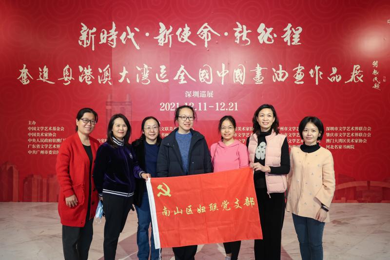 活动中,在广东省美术家协会会员、国家二级美术师陈濯非的带领下,26名深港少年参观了“新时代•新使命•新征程”奋进粤港澳大湾区全国中国画、油画作品展。