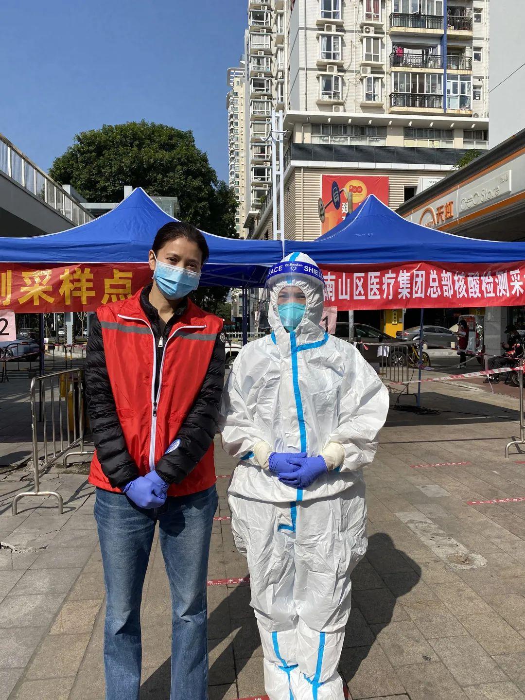 下午2点左右,核酸采样点一上午的忙碌工作告一段落后,袁咏仪提议与工作人员一起来个大合影,她想向近段时间冲锋一线的抗疫人员道声辛苦!