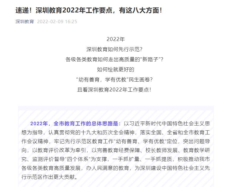 根据工作要点,2022年,深圳将加快建设一流大学、一流学科,制定实施深圳市高水平大学建设方案,支持深圳大学创建高水平综合性大学,支持南方科技大学创建世界一流研究型大学,支持深圳技术大学建设一流应用技术型大学,支持市内其他高校高水平特色化发展。