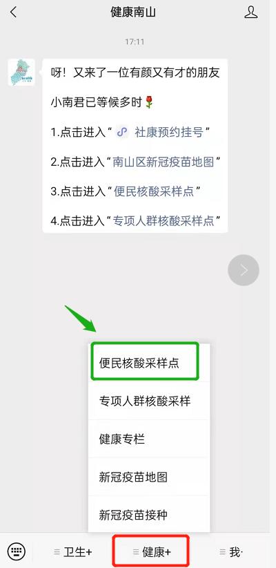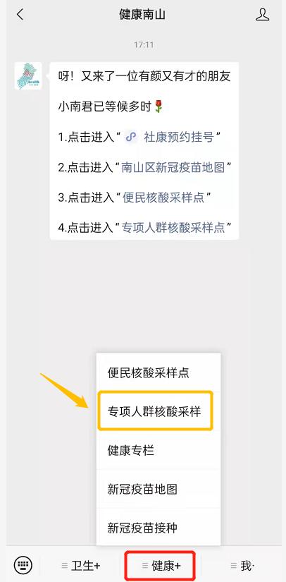3.点击“健康+”—点击“专项人群核酸采样点”
