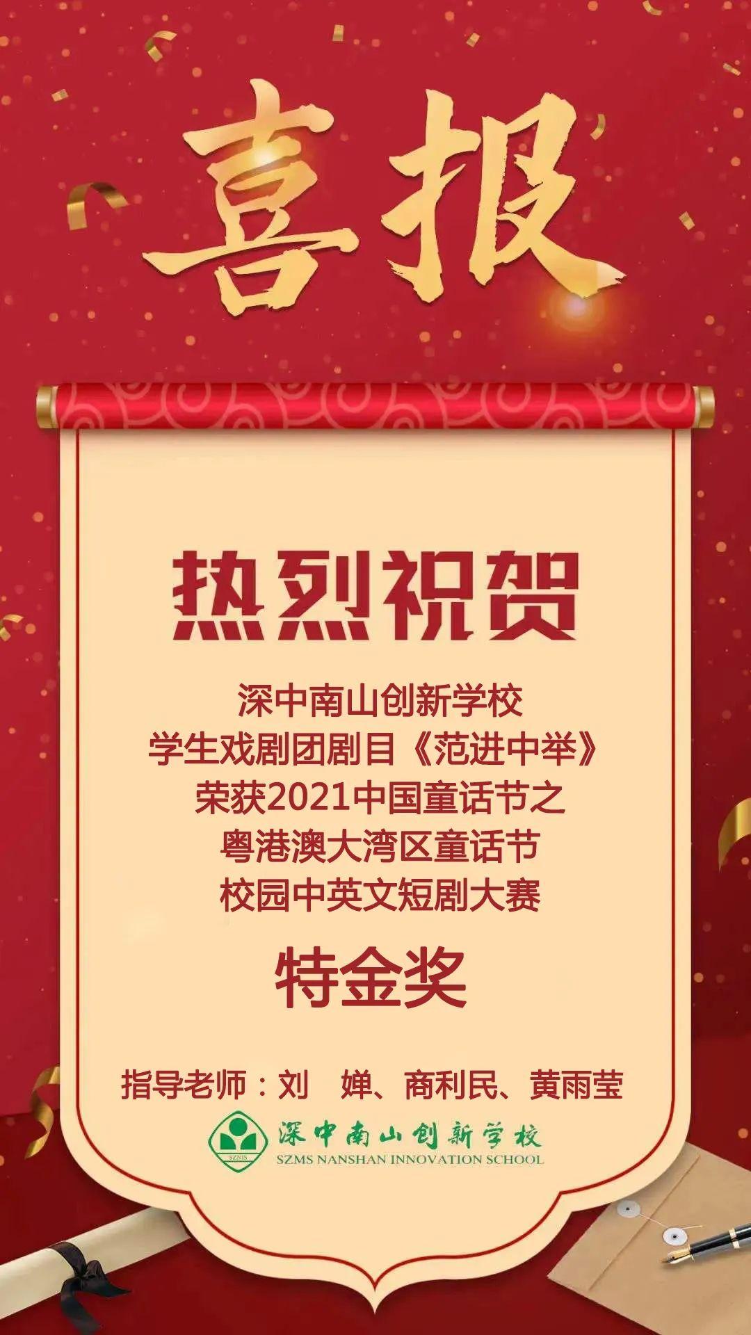 近日,深中南山创新学校学生戏剧团表演的《范进中举》在2021中国童话节之粤港澳大湾区童话节校园中英文短剧大赛脱颖而出,荣获特金奖!