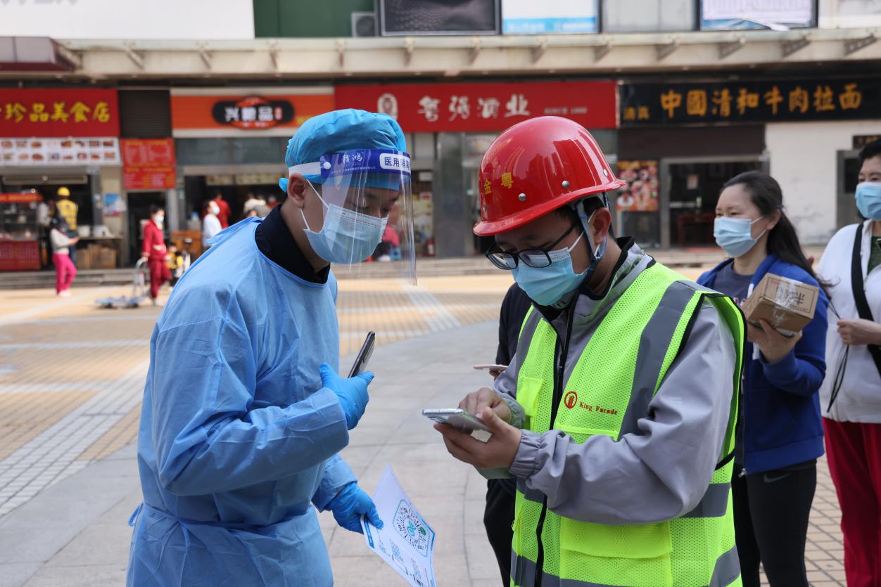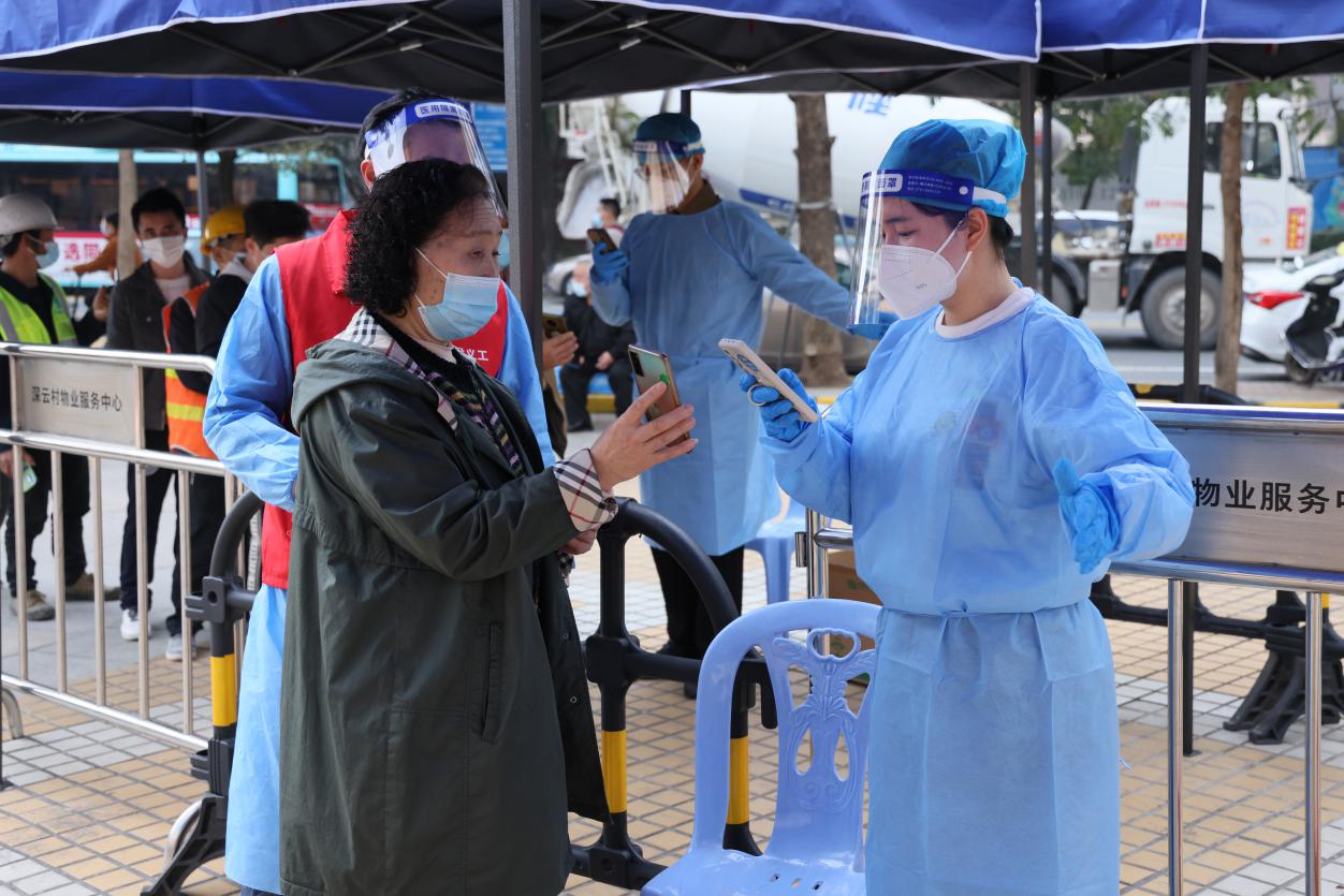 深业沙河集团应急抗疫突击队成员在沙河街道高发社区深云村协助开展核酸检测