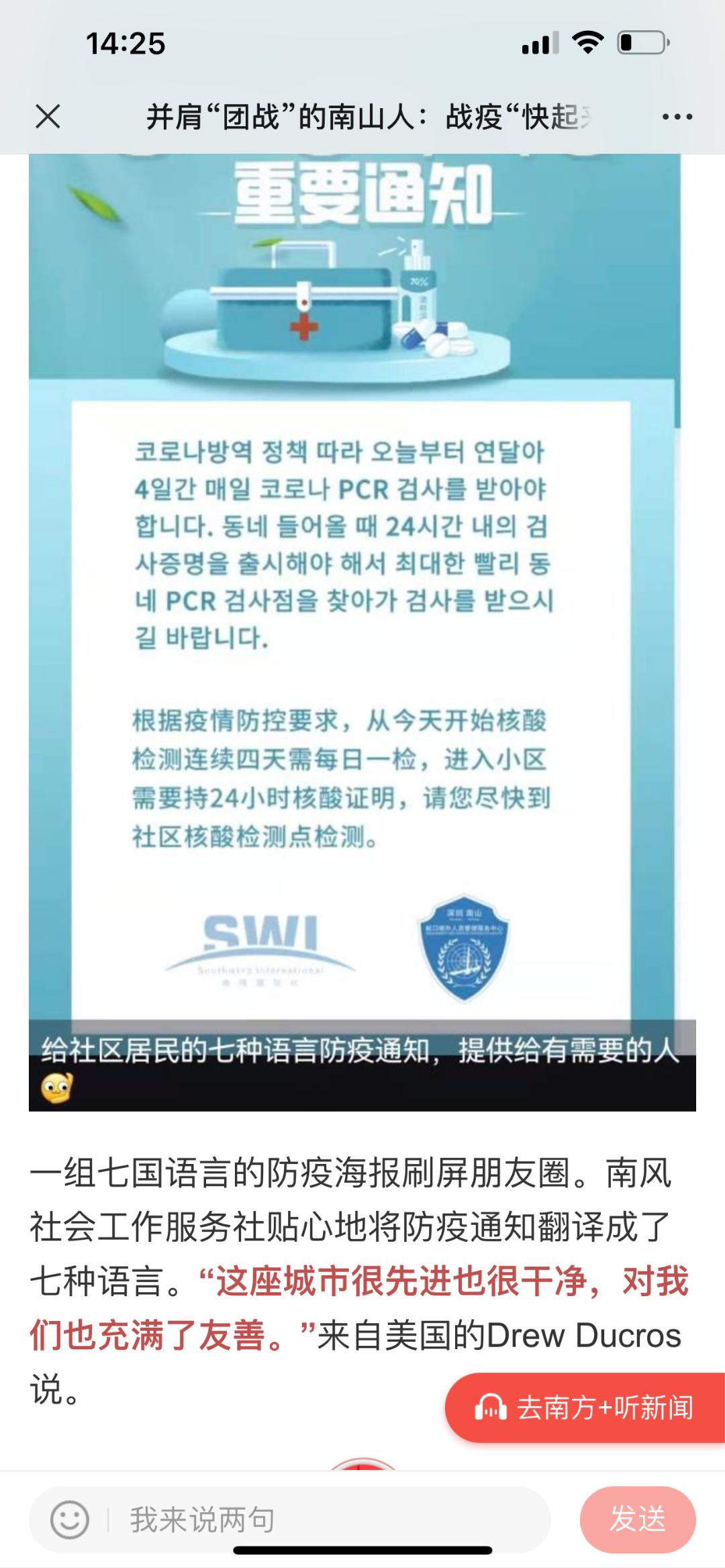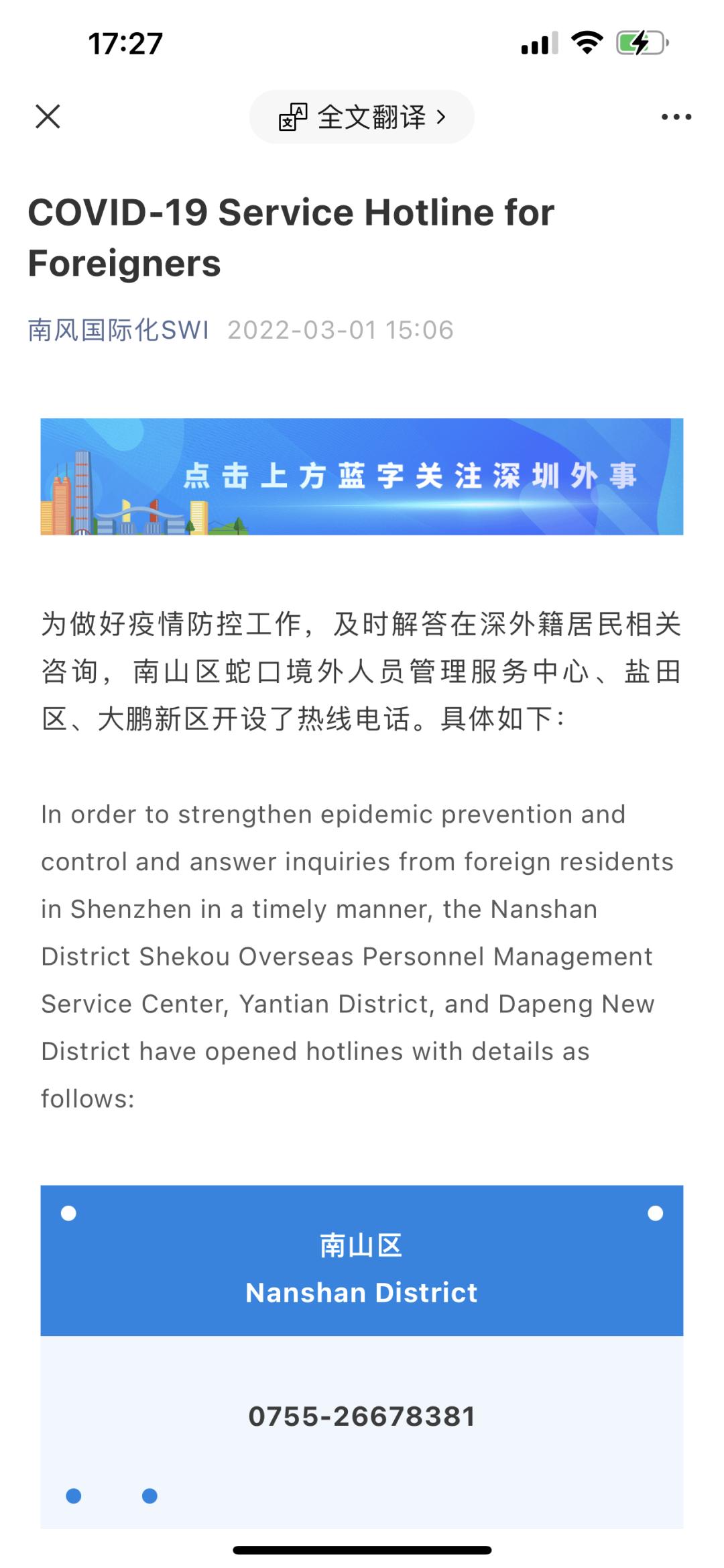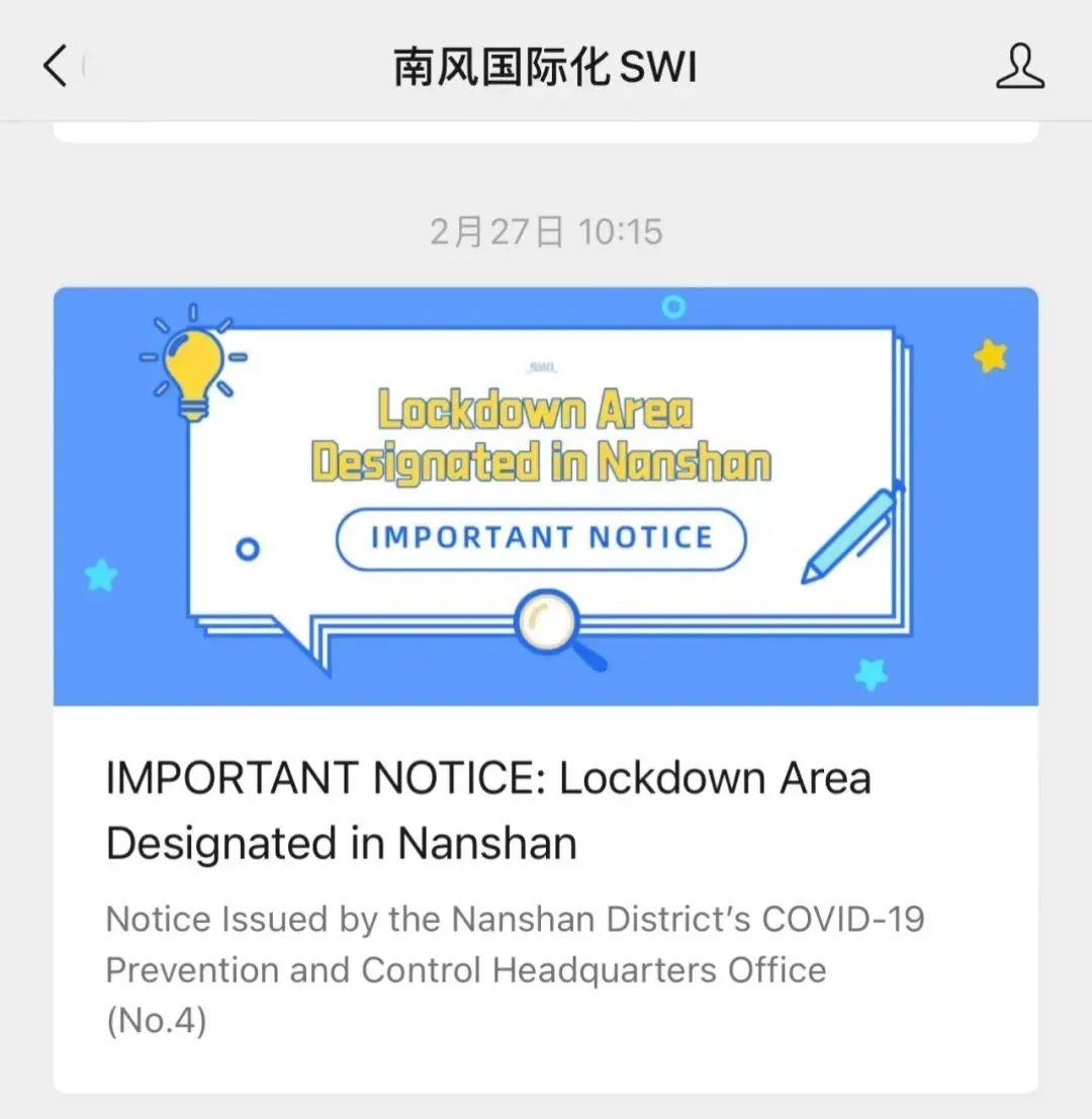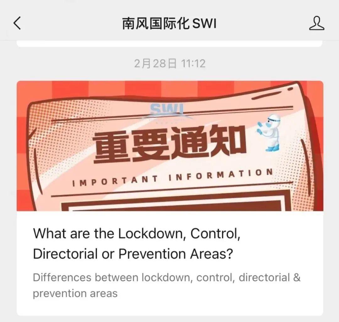 在外籍人员聚集的招商、蛇口许多区域被划为封控区、管控区、参照管控区管理区和防范区后,区委外办在南风国际化SWI公众号上发布双语说明,短时间阅读即超过2000。
