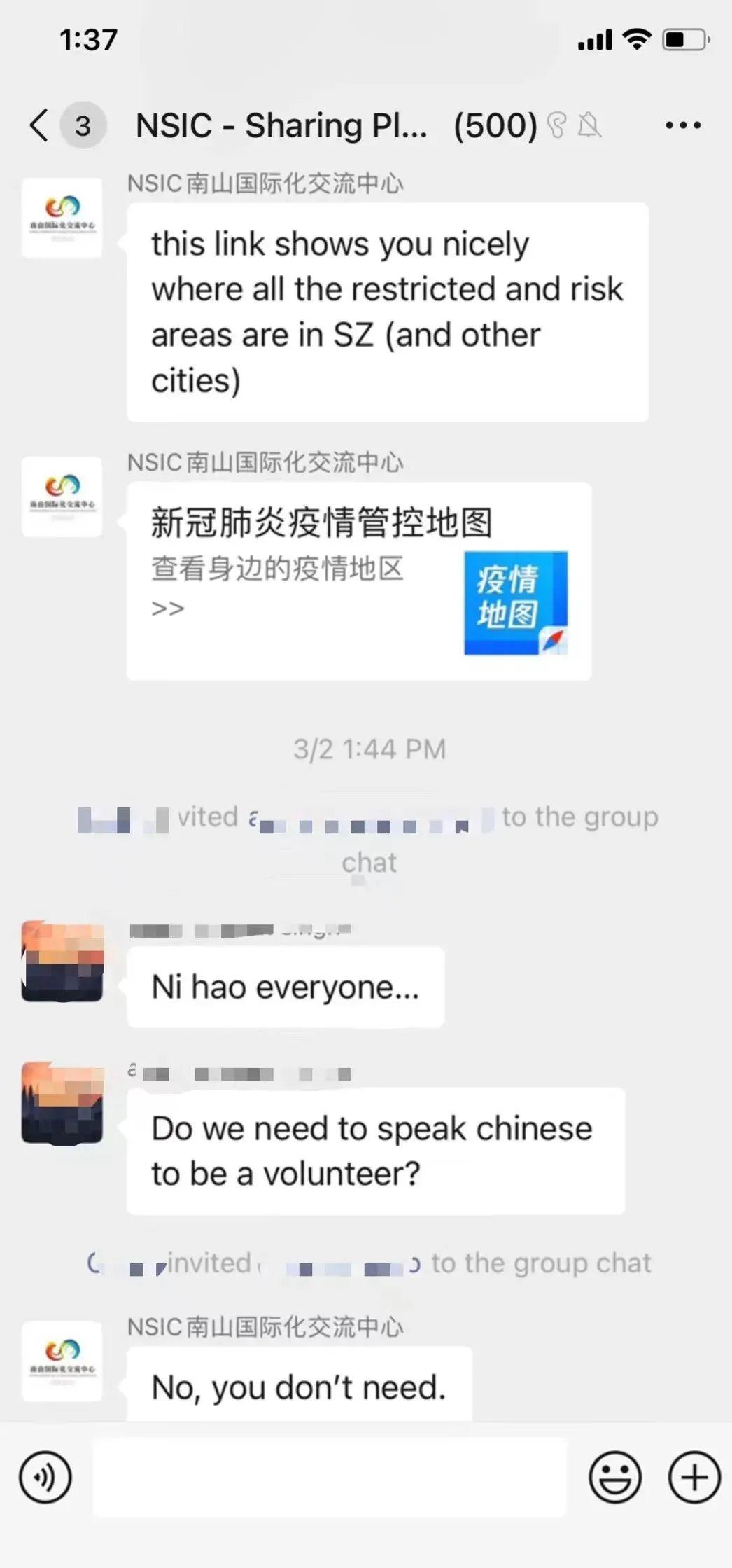 南山国际化交流中心通过有3000好友的官方微信号(NSIC2018)在3个500人大群及2个志愿者群和若干活动群、朋友圈等实时发布疫情地图,线上随时解答疑问,缓解外籍人士的焦虑。
