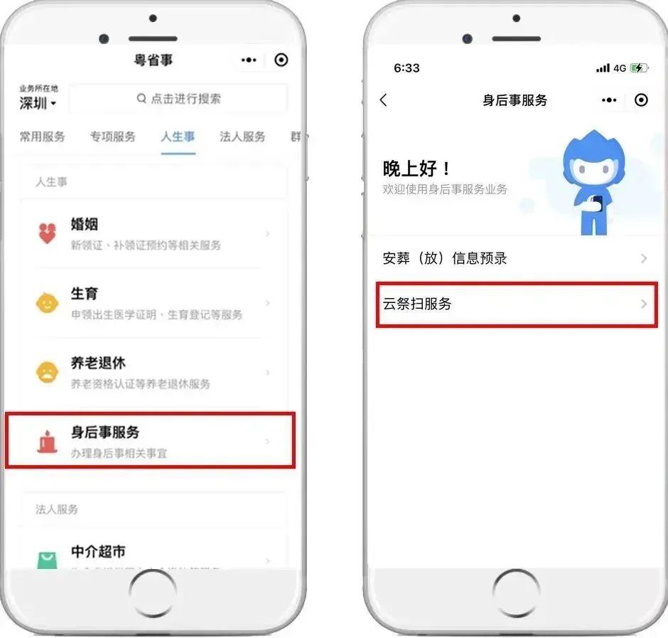 方式二:登录“粤省事”小程序后,在底部菜单栏点击“办事”一栏,进入页面后选择“身后事服务”,点击“云祭扫服务”,办理相关业务。