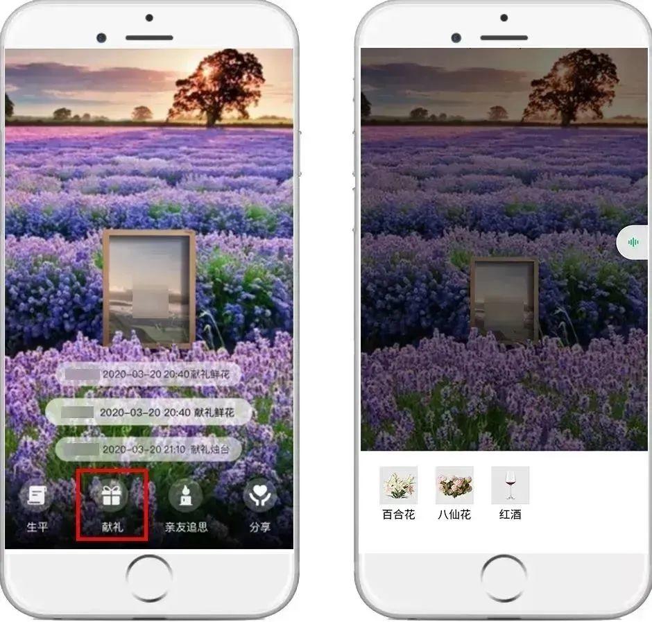 点击“献礼”即可向亲友献花、献酒表达哀念之情。