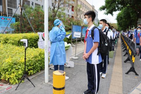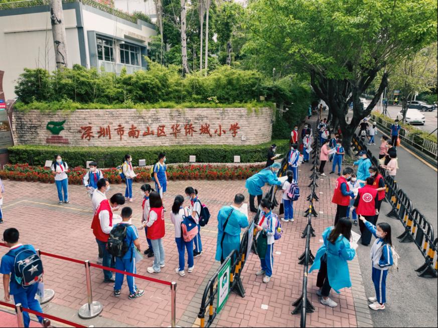 4月13日清晨,深圳市南山区华侨城小学严格按照“分区域、分年级、分楼层”的防控管理要求,指引900多名同学顺利返校。
