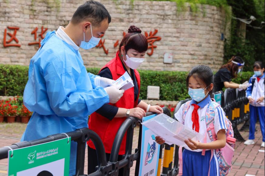 “错时错峰”“正确佩戴口罩”“坚守一米线”“入校消毒”“主动测温”……孩子们井然有序地进入校园。