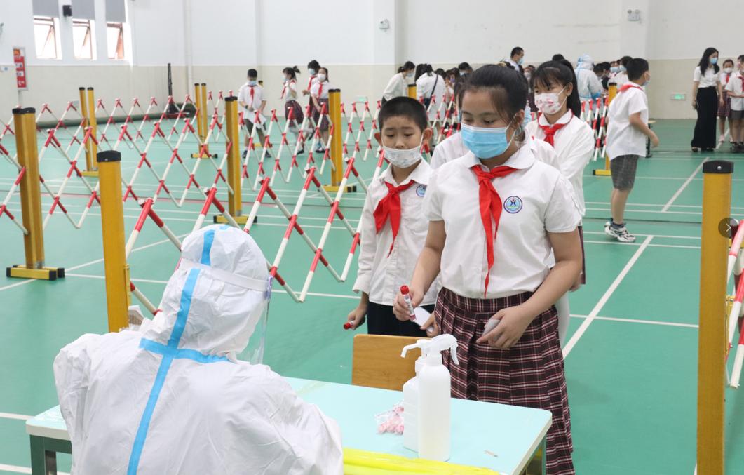 为了严防病毒进校园,西丽小学严把入校关,严审白名单,为每名师生、后勤、保洁、保安等所有涉校人员建立个人健康台账,同时发放入校卡,要求持“证”返校,学校还在体育馆设置了核酸采样点,全体教职工和学生分批次进行采样。