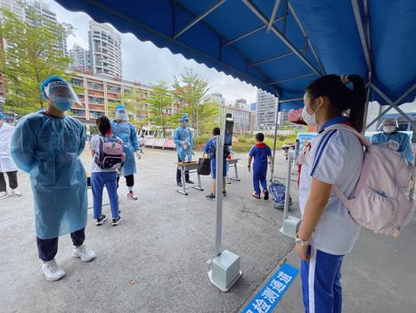在海德学校,黄湘岳一行查看了校园的临时隔离点和核酸检测点,对学校的各项防疫措施提出建议,“海德学校是九年一贯制学校,初中和小学的学生在进入校门后就要马上分流,避免接触。”来到校门外,看到围栏处学生有与外界接触的风险,黄湘岳指出,可以在校园周边拉一条“距离线”,保障学生的学习环境“零污染”。