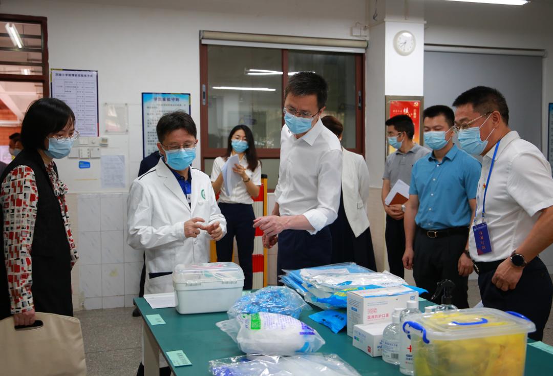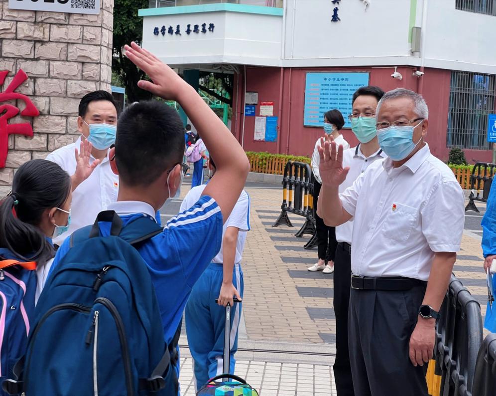 4月13日上午,南山区委副书记、区长黄湘岳率队前往西丽小学、海德学校检查督导学生返校及校园疫情防控工作,区委常委、区委(政府)办公室主任李威陪同调研。