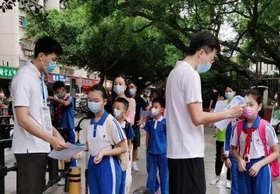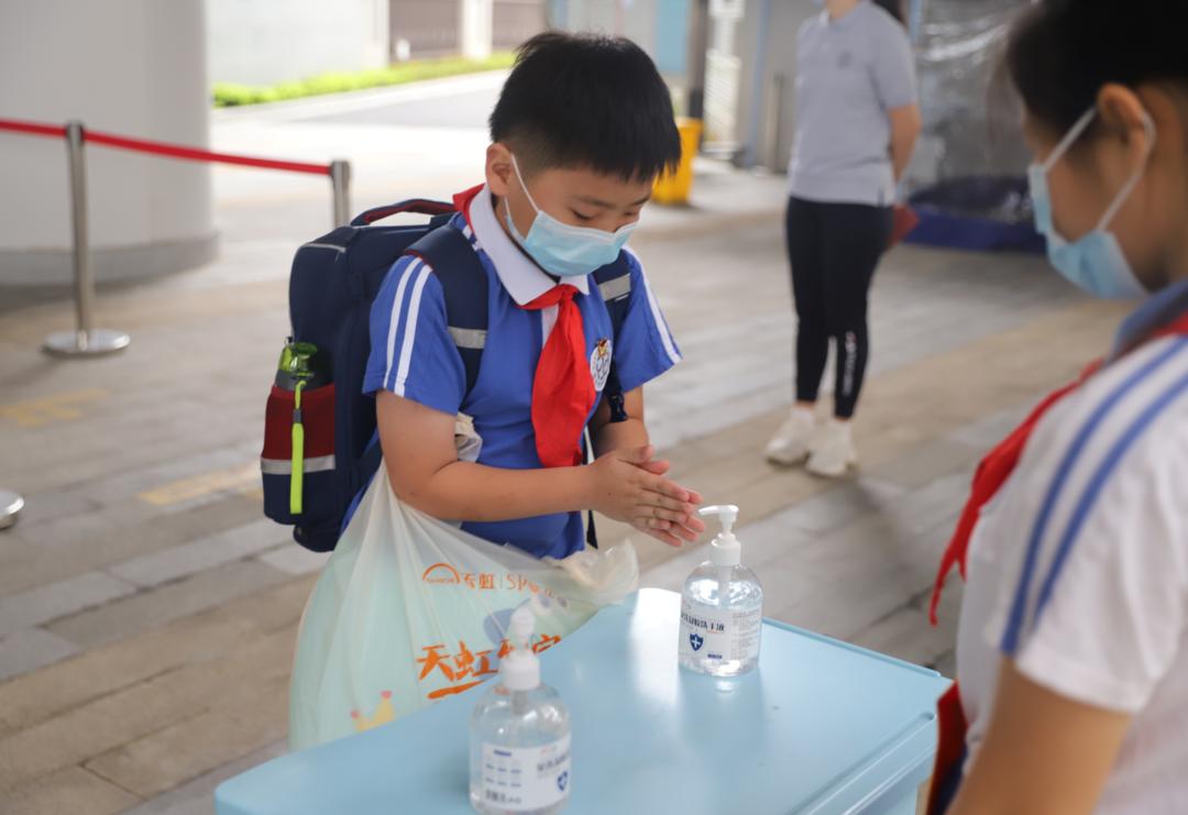 孩子们淡定从容、自信和悦,戴着口罩,并有序排队、测温、消毒,错峰入校