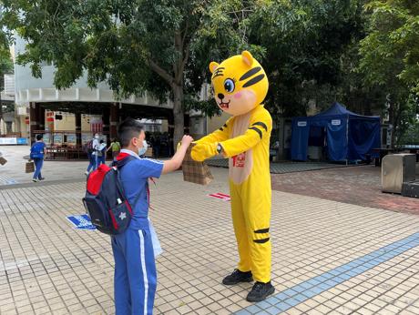 前海学校的少先队大队干部们和小老虎“黄黄”、“红红”早早地进入校园,做好小小指引员。