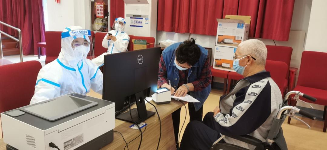 为配合疫情防控措施,接种团队成员需穿上“大白”全套防护“装备”,在N95口罩和面屏的双重防护下,连耳朵也被包裹进防护服,老人又大多存在听力减退,为保证与老人们的顺畅沟通,医务人员就尽量提高声量,反复确定老人听清、理解,几小时下来,嗓子就不同程度的沙哑。登记医生、接种护士、保障医护以及信息保障工程师,在防护服下连续8小时不停歇,共同为老人搭建起疫苗接种的“绿色通道”。
