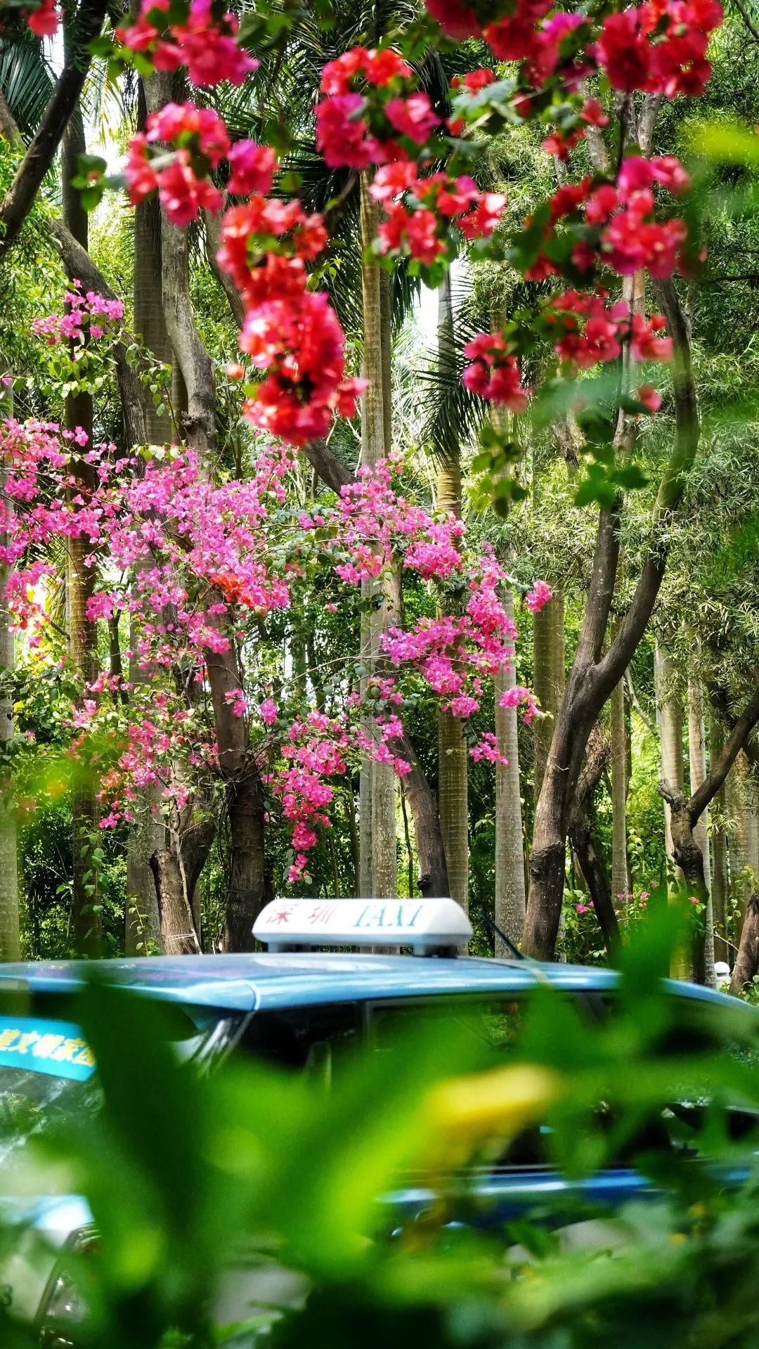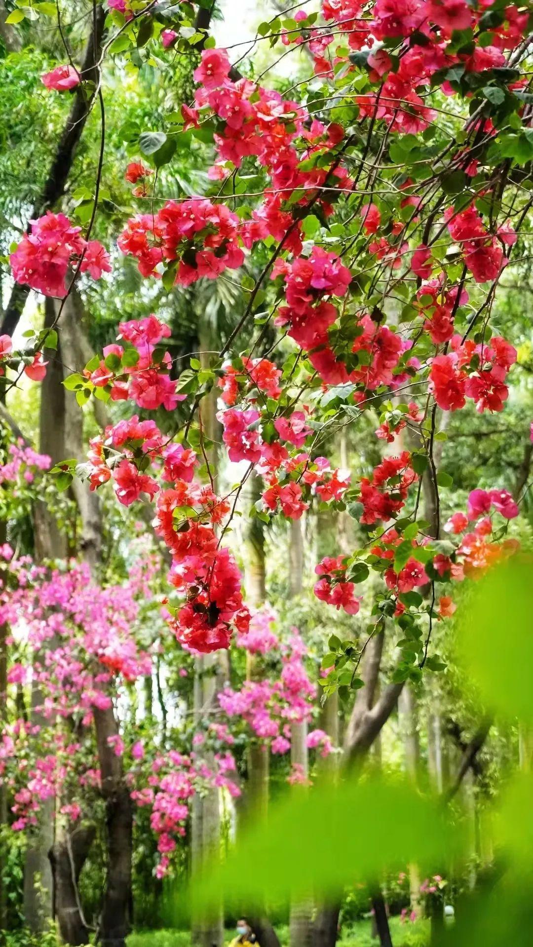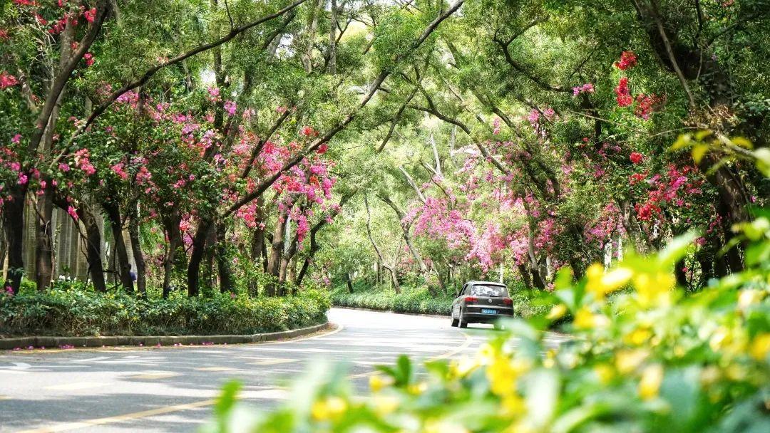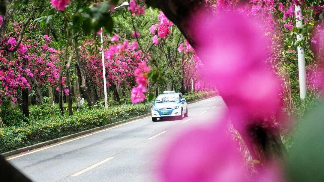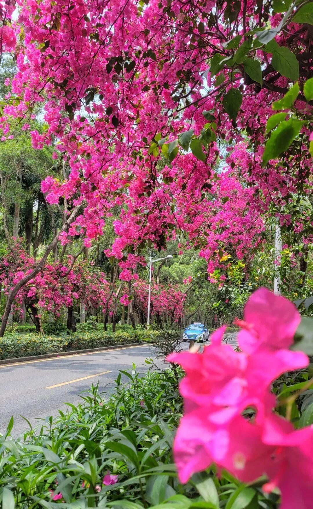 4月的南山,阳光灿烂,花开满城。在南山区华侨城香山中街可以看到,簕杜鹃开满枝头,流连一路,不少摄影爱好者到深圳这条长约1800米的网红簕杜鹃花道打卡,在繁花绿树的映衬下,整条马路被装饰得多彩明艳,格外浪漫。