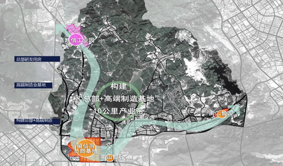 深入推进“总部研发+高端制造”10公里产业带建设;升级改造百旺信工业园、红花岭工业南区;加快建设南山科技创新中心、湾区创新大厦、深港科学园推进平山人才小镇、恒通产业园。